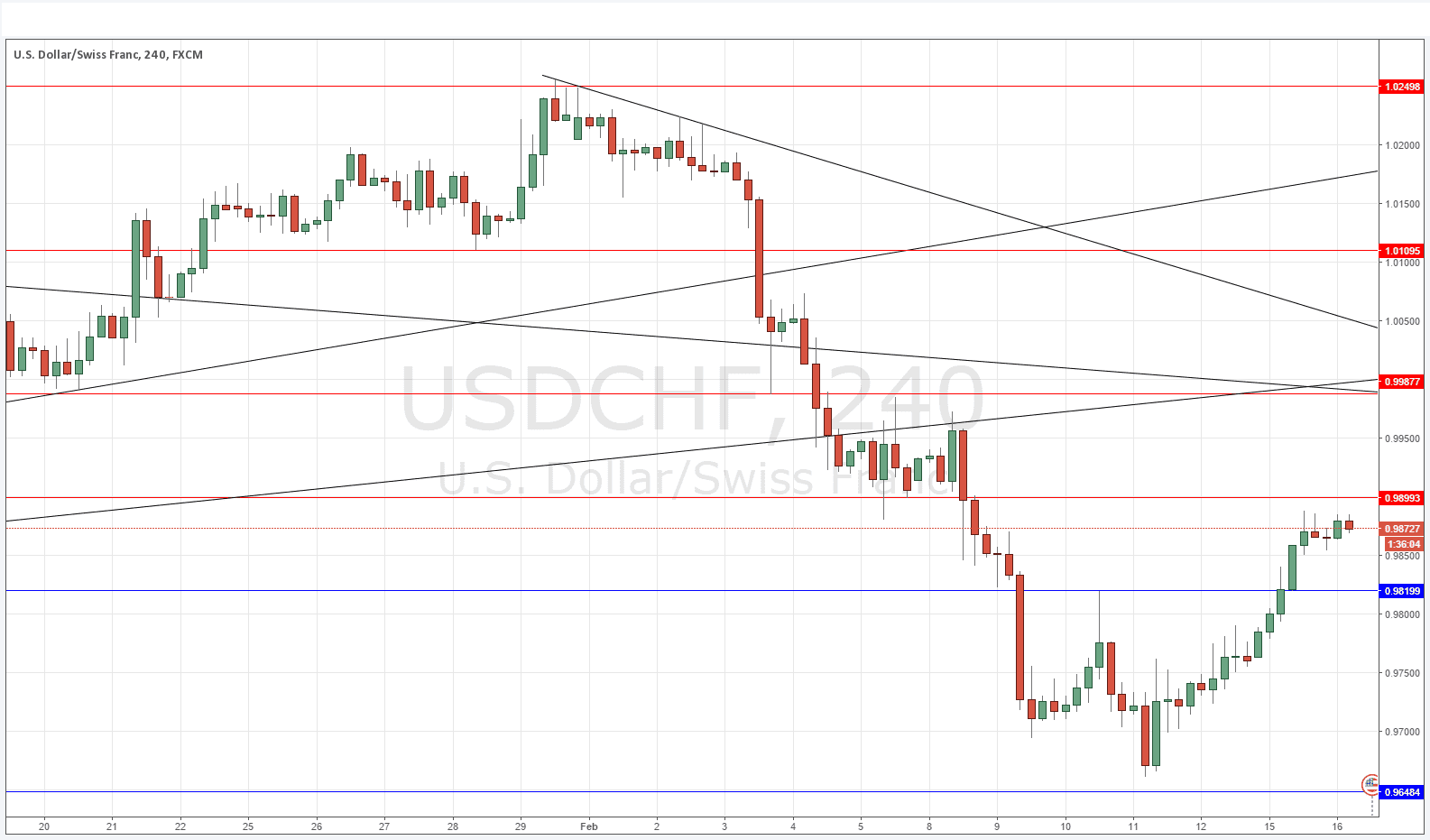 I was right to be cautious about going short off 0.9850 as the advance was truly solid, and carried beyond that area of resistance, bringing us to within sight of 0.9900 which is another key level at which we may see a bearish reversal, if it has not happened already. Above that there is a really solid looking area of resistance where two old trend lines are confluent with the horizontal level at 0.9987.