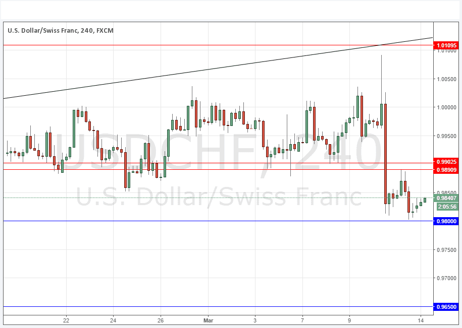 This pair was dragged along by EUR/USD during last Thursday’s very large move in the price of that currency pair. We are now in an interesting position here where although there is no clear long-term trend, we are close to key support at 0.9800, but we also have the 0.9900 area above which is likely to be good resistance, at least upon the first test. This means that day traders today could focus on fading those areas and have a good chance of making some pips in either direction.