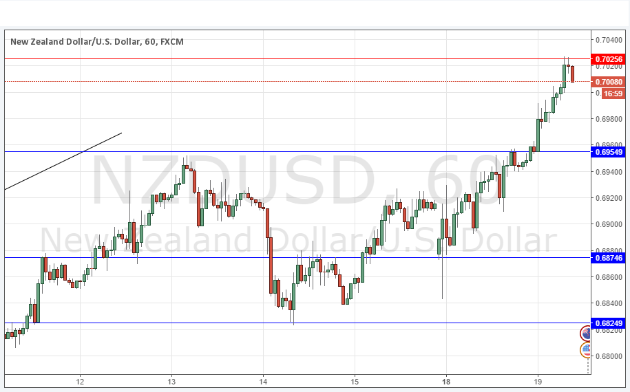 This pair has been the most bullish of the all the more major Forex currency pairs. New resistance to support has been printed at 0.6955. So far, the anticipated resistance at 0.7025 has held, and if it not touched again until the New York open, and there is another clear bearish rejection there, then a short trade entry signal is given.