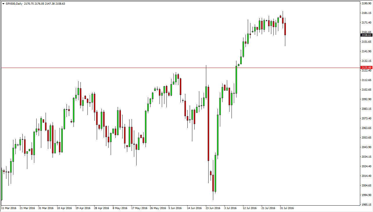 The S&P 500 initially tried to rally during the day on Tuesday, but then broke down rather significantly. This is a pretty negative candle, but having said that I believe that there is more than enough support below to keep this market afloat. The 2125 level is the absolute “floor” in this market as far as I can see, so therefore I have no interest whatsoever in selling. This is a market that sooner or later should form some type of supportive candle that we can serve buying, as I believe that the recent breakout was of course a very significant. Because of this, I am a buyer of supportive candles and of course bounces below. The S&P 500 is not a market that have any interest whatsoever in selling, low interest rates continue to be the environment that we find yourselves in, which generally helps stocks.