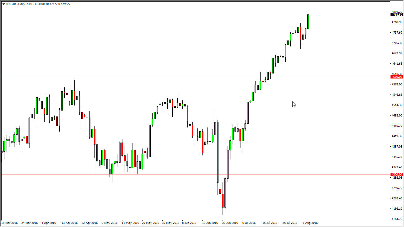 The NASDAQ 100 broke higher during the course of the session as well, breaking out to a fresh, new high. The NASDAQ 100 had been a bit behind the other indices in the United States, but has most certainly jumped well above the other ones as far as momentum is concerned as we have shown quite a bit of strength. I still believe that the 4600 level below is massively supportive, but quite frankly I think that we are starting to see a bit of a “floor” near the 4700 level as well. This candle is very impressive, and in fact I believe that we are now reaching towards the 5000 level given enough time. With this, pullbacks will offer value the people will take advantage of, and shorting the NASDAQ 100 isn’t even a thought at this point in time.