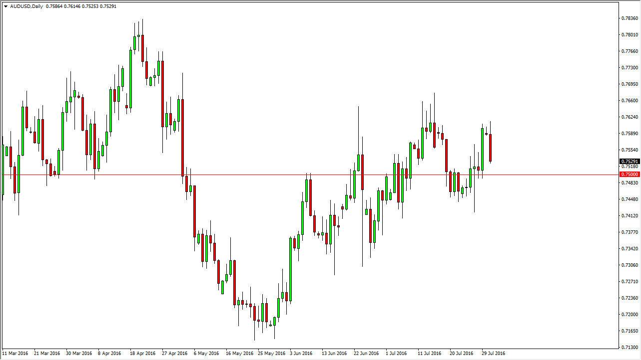 The AUD/USD pair initially tried to rally during the course of the session on Monday, but then fell apart and reached towards the 0.75 level. Because of this, I believe that the market is about to find support in this general vicinity but you have to keep in mind that this particular session is going to be interesting due to the fact that the Reserve Bank of Australia has an interest rate announcement during the course of the day, and that of course can cause quite a bit of volatility. There is a significant amount of support just below, so it’s likely that we could get a bounce but at this point in time it’s probably best to simply sit on the sidelines as we wait for some type of clear direction.