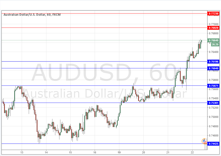 Yesterday’s signals produced a (barely) profitable trade following the bearish outside candle rejecting the identified resistance level at 0.7605. It only gave the minimum 20 pips of profit.