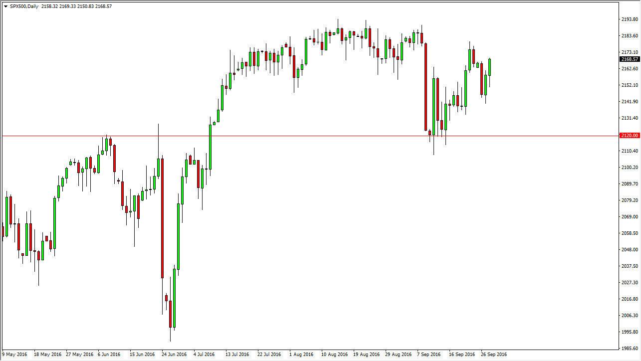The S&P 500 had a very volatile session during the day on Wednesday, as we initially fell and then shot higher. Because of this, I think we’re going to test the resistance area above so I think short-term pullbacks are buying opportunities. With that being the case, I would anticipate that we are going to reach towards the 2200 level above. That was where we had seen quite a bit of resistance, and as a result I believe that we are trying to build up enough momentum to finally go above there. I believe that the “floor” is near the 2120 handle, so as long as we pullback I am more than willing to start buying this market. I have no interest in selling this market, especially considering that the interest-rate situation in the United States should continue to be very negative.