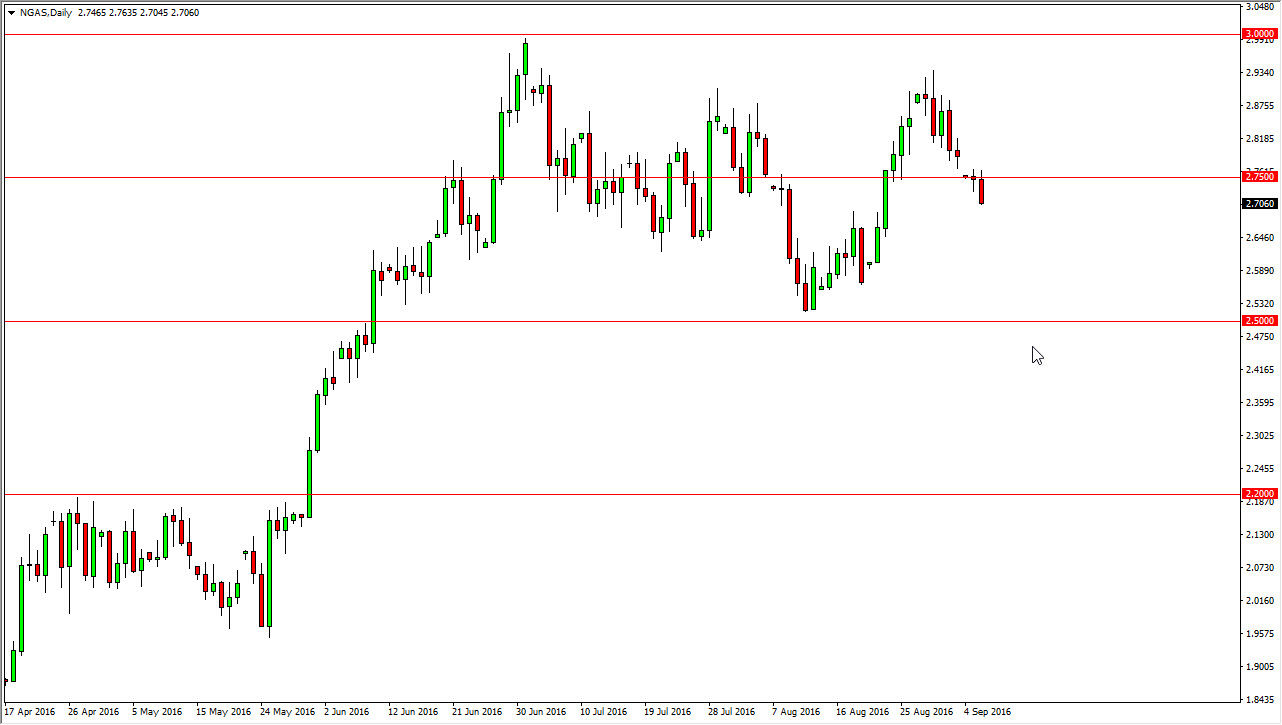 The natural gas markets broke down during the day on Tuesday, breaking the bottom of the hammer from the Monday session. This of course is a very negative sign and I feel that we are going to reach down to the $2.65 level, and then possibly the $2.50 level below there. I think at this time, it’s very likely that any rally will be sold off, as it makes quite a bit of sense due to the fact that we gapped lower on Monday, and of course the storms that people were so worried about in the Gulf of Mexico are now gone. With that, there should be much in the way of supply disruption, and of course summertime cooling season is starting to come to an end in the northeastern part of the United States. With that, I remain negative, and I believe that rallies offer selling opportunities on signs of exhaustion.