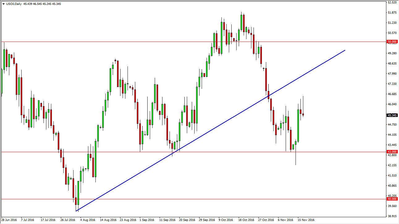 The WTI Crude Oil market try to rally initially during the day on Thursday but found enough selling pressure above to turn the market back around and form a shooting star. The shooting star of course is a negative sign, and the fact that we formed one on Wednesday also tells me that this is a market that is going to continue to struggle overall. Because of this, I feel that the market is going to roll over and perhaps trying to reach towards the $43 support level again. I believe a break down below the bottom of the candlestick for the session on Thursday is reason enough to get short. The oversupply of the market continues to be an issue, and on top of that we have a strengthening US dollar which of course works against the value of commodities as well.