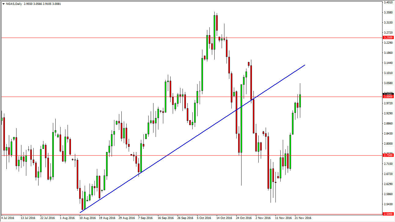 The natural gas markets initially fell during the day on Wednesday, but then turned around to break high above the $3.00 level. We turned right back around to close just above the $3.00 level though, so having said that I see quite a bit of volatility in this area. We have a previous uptrend line just above that should be resistance, so I think it’s only a matter of time before an exhaustive candle comes back and turns this market right around. I don’t really have any interest in buying this market even though I know that seasonality should help, as the northeastern part of the United States is getting cold. However, the market also has to deal with the fact that there is a massive amount of oversupply longer-term, so every time that natural gas rallies, I look for reasons to start selling. Most natural gas contracts are traded in the United States though, and with today being Thanksgiving it’s going to be a very quiet electronic session.