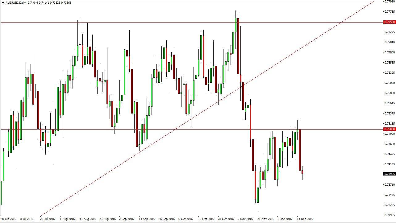 The Australian dollar initially broke above the 0.75 level during the day and then fell apart as the Federal Reserve suggested there would be more interest rate hikes going forward. Because of this, there was a lot of bearish pressure on Golden that of course works against the value of the Australian dollar itself. The US dollar continues to be the strongest currency in the world overall, and that is not going to be any different in this particular currency pair. However, we did see a little bit of support at the 0.74 level so I think that this is the type of market that you will sell rallies as they come on short-term charts. I have no interest in buying the Australian dollar, because most of the global strength when it comes to currency and economic growth is going to be found in North America, and not in Asia which is what the Australian dollar represents to most traders. With this, I believe that this market will reach lower, perhaps reaching to the 0.73 level that had previously been the lows.