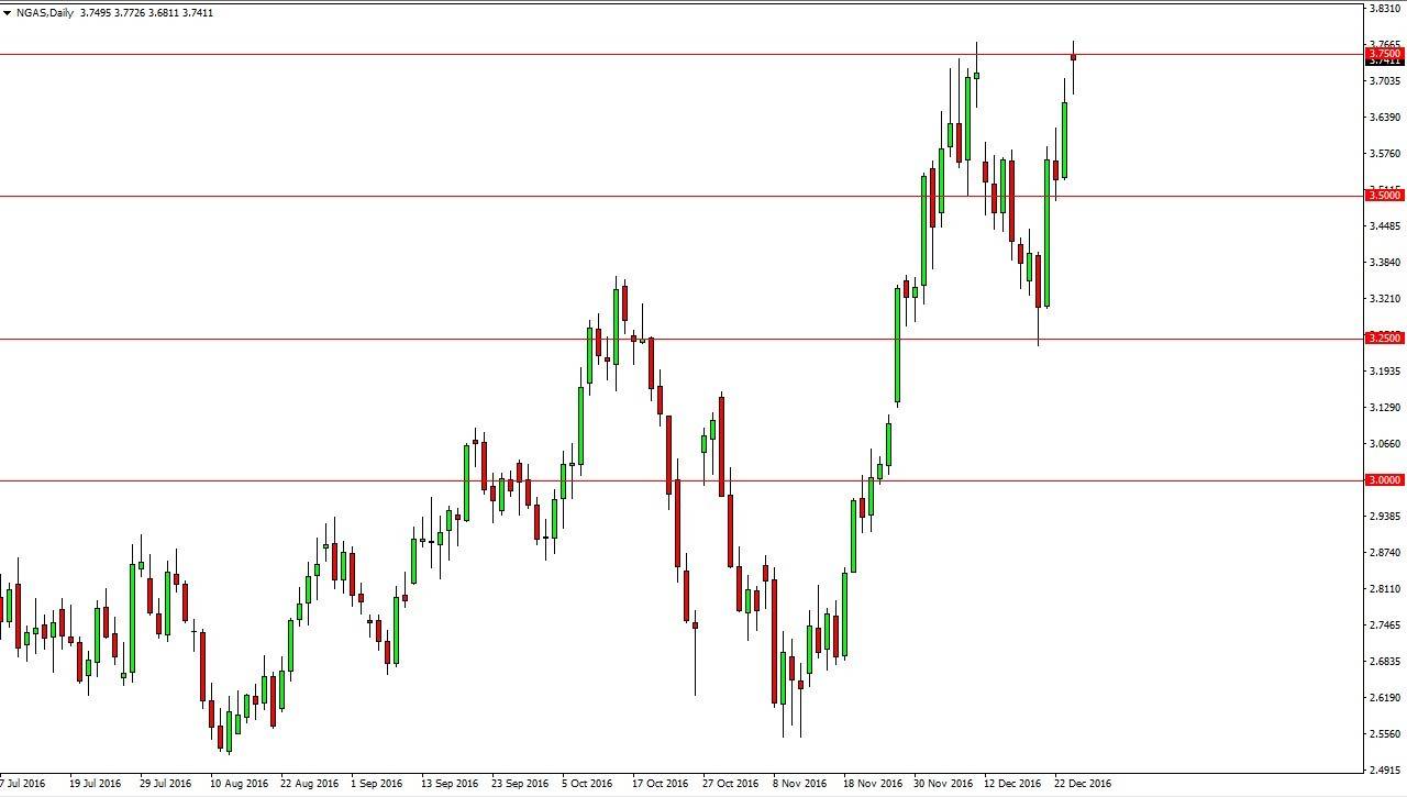 The natural gas markets gap tire at the open on Tuesday, then turned around to fill the gap, and then closed near the $3.75 level. If we can break above the top of a hammer, it’s likely that we will continue to go higher but there is a lot of noise between here and the $4 level that could cause quite a bit of volatility. Because of this, I expect that it could be very choppy going in the near term, but I have to think that it’s only a matter of time before the buyers return every time we pull back.