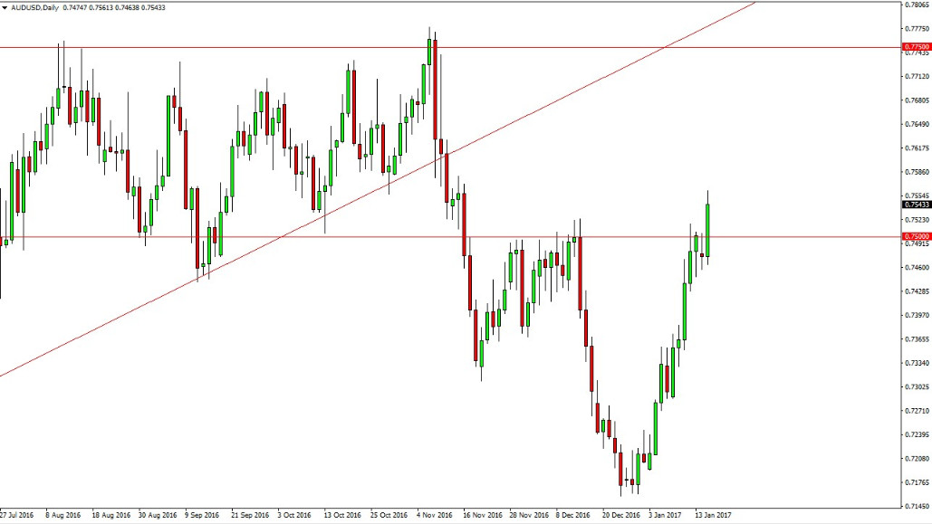 The Australian dollar broke above the 0.75 level, showing significant signs of strength. The bullish candle of course is a very strong sign, as we have cleared the psychologically important level. The strength of candle is strong, and of course we should keep in mind that the gold markets have shown real strength as well. We are overextended, so I think that a pullback is probably needed. If we can break above the top of the candle for the session on Tuesday, I think the market then goes to the 0.7650 handle. Nonetheless, I am a bit cautious when it comes in this market because we have gone straight up from the 0.7150 handle. This has been an extraordinarily strong move, so getting involved now would only be chasing the trade.