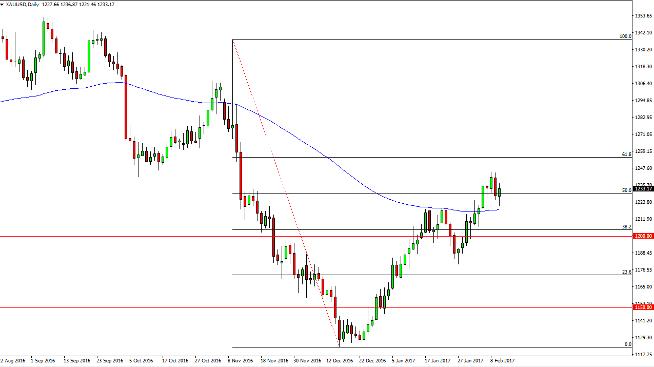 Gold markets initially fell during the session on Friday, but found enough support at the 100-day exponential moving average to turn things around and form a nice-looking hammer. We are right at the 50% Fibonacci retracement level from the Donald Trump shock election result, so it makes sense that there will be a lot of interest in the market currently. If we can break above the top of the hammer, I think we will then reach towards the 61.8% Fibonacci retracement level, which is the $1250 level. In general, it appears that the US dollar is struggling, and the gold markets will continue to show strength due to that. Because of this, if you are diligent enough it’s likely that you will make gains by going long. I think this is a longer-term move just waiting to happen, and as a result if you can pile into the position in small increments, things could turn out quite well for you.