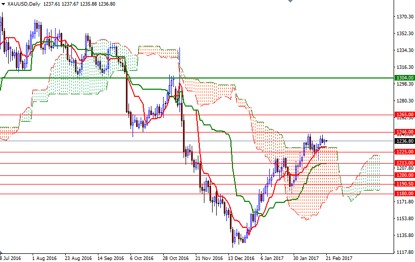 The market is trading above the daily and the 4-hourly Ichimoku clouds and we have positively aligned Tenkan-Sen (nine-period moving average, red line) - Kijun-Sen (twenty six-period moving average, green line) crosses. Despite positive short-term outlook, flat Tenkan-sen and Kijun-sen indicate there is a lack of momentum. Unless prices break up above 1239, the market will have a tendency to return to the daily cloud - in other words, the support in the 1232/29 will be tested. The bears will need to capture this strategic camp so that they can increase pressure and drag the market towards 1225. If XAU/USD falls through 1225, then 1220/19 will be the next target.