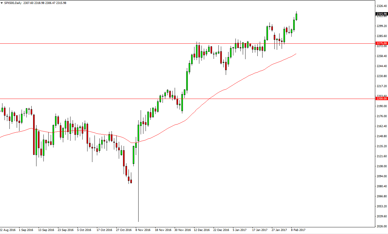 The S&P 500 rallied on Friday as we continue to see strong bullish pressure in this market. We have broken above the 2300 level now, and that of course is a very bullish sign. Because of this, I believe that every time this market pulls back, you must be thinking about buying. It should be thought of as value, as this market looks set to go to much higher levels, and quite frankly levels that could reach as high as 2500 over the next couple of months. I believe that the 2275 below continues to offer a floor, and that floor will of course continue to move higher. The 50-day exponential moving average shows significant bullish pressure as well, and US stock markets should continue to lead the rest of the world’s indices higher.