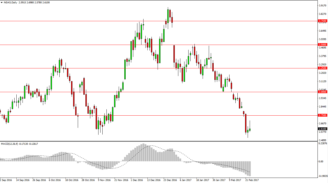 Natural gas markets tried to rally during the session on Thursday, but turned around to form a very bearish looking candle. I believe that every time this market tries to rally, it’s likely that we will sell off. The $2.75 level above should continue to be massive resistance, so having said that I think it’s only a matter of time before we breakdown below the $2.5 level. I do think that we need to build up momentum because we are so massively oversold, so given enough time I think it’s a matter of time before the markets find themselves breaking down massively. Given enough time, I have no interest in buying this market, at least not until we break well above the $3 level, which is something that I don’t see happening anytime soon. In fact, I believe that the $2 level will continue to be a target the longer-term traders are aiming for.