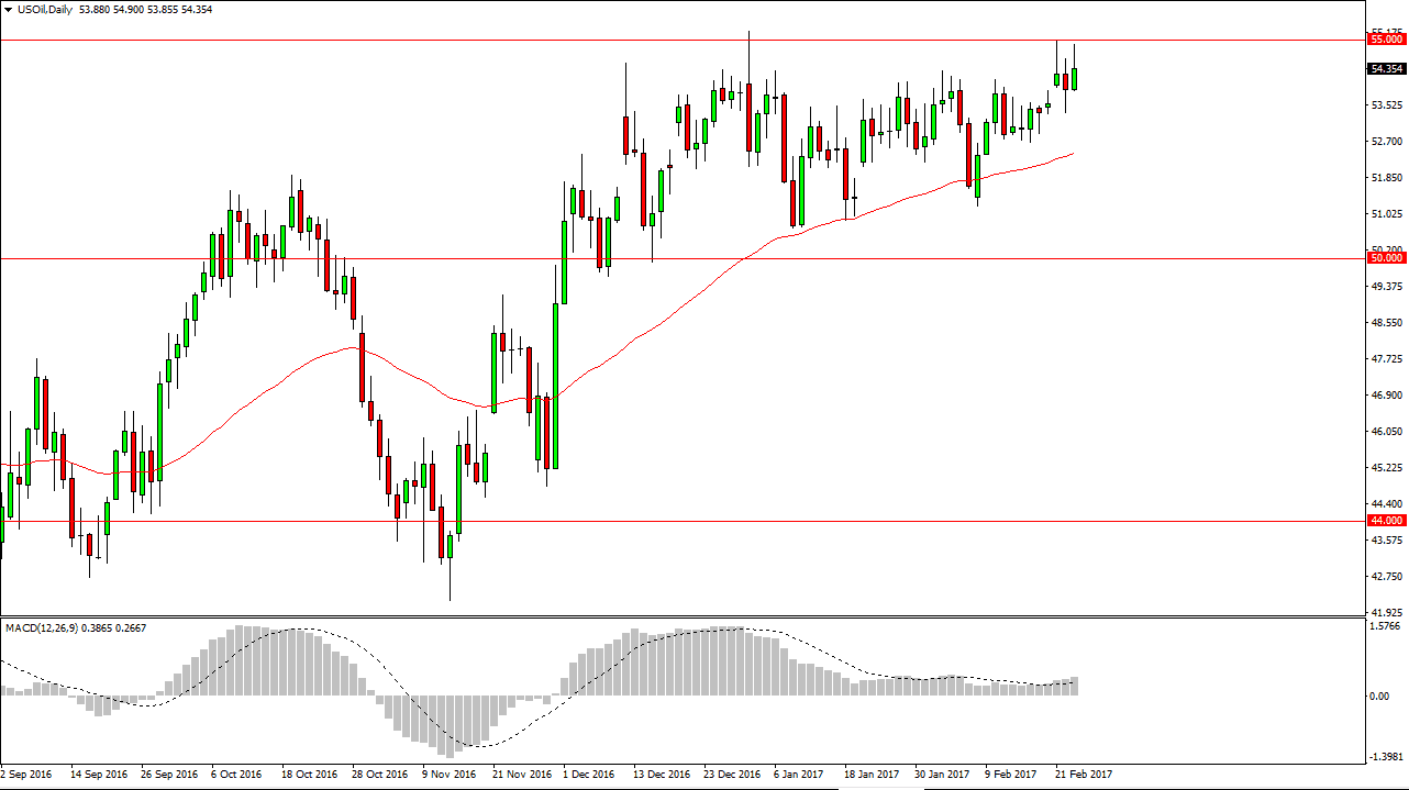 The WTI Crude Oil market rally during the day on Thursday, as the building inventories was less than expected. However, the market looks like it is still going to struggle with the $55 level. That resistance should continue to be a problem in this market, and I believe that as soon as we break above the $55 level that you can start buying this market. If we can go back and forth in the meantime, I think that short-term traders will continue to take advantage. Longer-term, I still believe in the bearish picture, because quite frankly the oversupply is getting out of control. However, you have to follow what the market does, not what it should do.