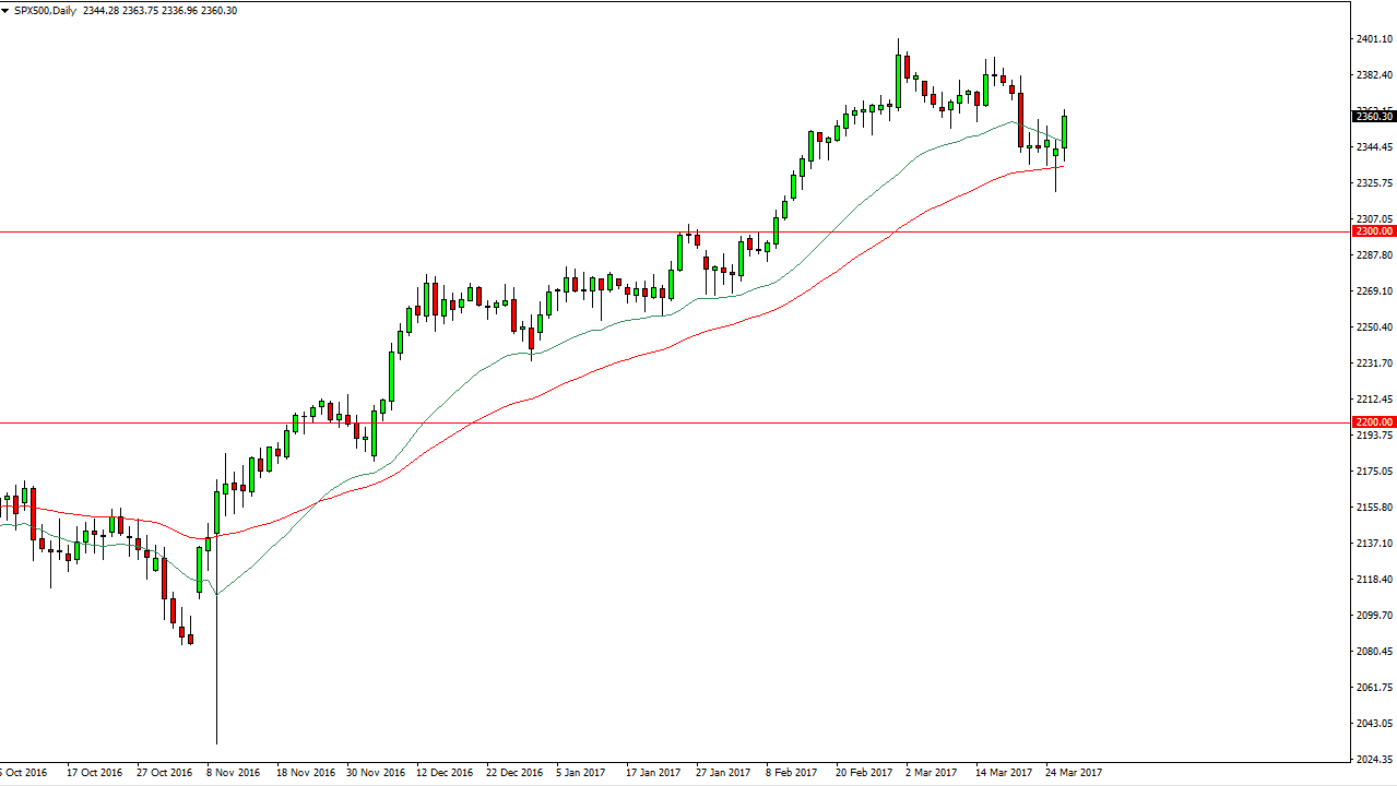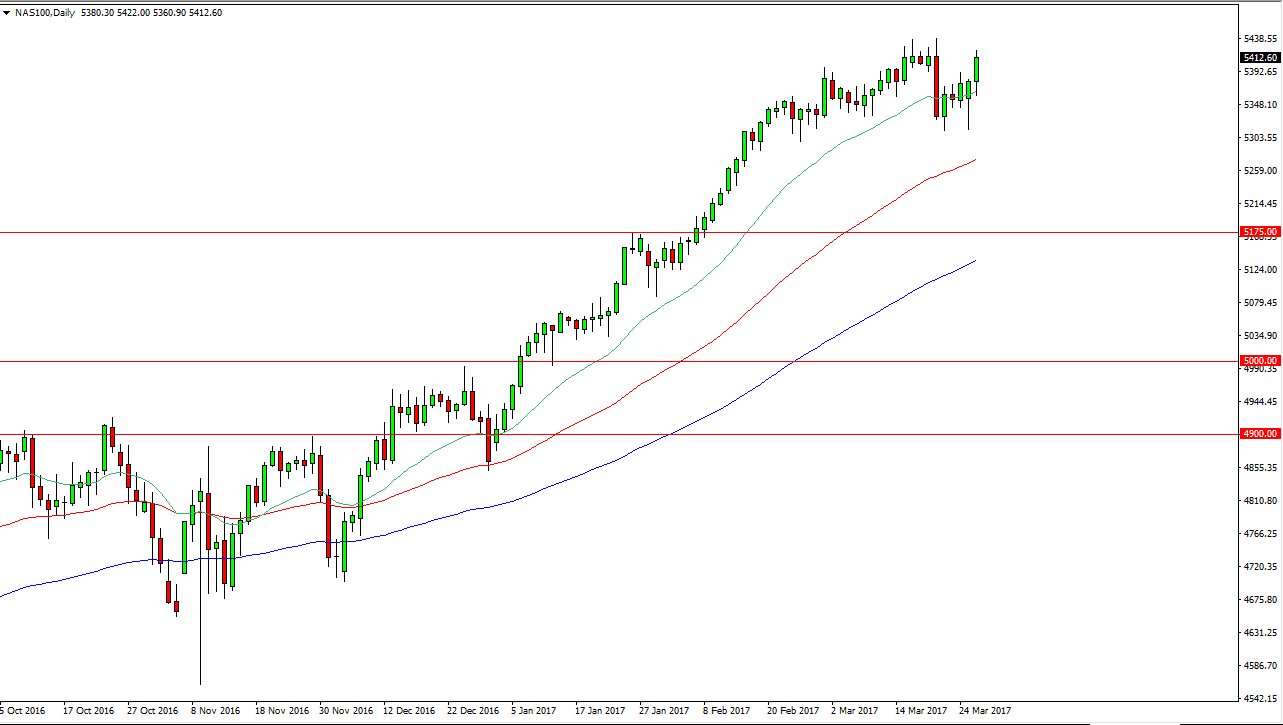 The S&P 500 initially dipped at the open on Tuesday, but ended up breaking above the top of the hammer from Monday and that is a very bullish sign. However, we stopped at the most recent support level in the uptrend, so we may get a little bit of a pullback. Ultimately, I’m still very bullish in this market and I think that we reach towards the 2400 level given enough time. In fact, I believe that we break above there as well, and go reaching towards the 2500 level which is been my longer-term target for quite some time now. With this being the case, I look at pullbacks as buying opportunities as we have seen over the last 24 hours.