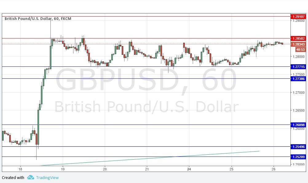 This pair has again, for yet another consecutive day, remained within the area defined by 1.2850 and 1.2772. I wrote that an upwards move was likely yesterday after London opened and this is what happened. The bullish breakout which occurred on Tuesday last week remains significant, making a further upwards movement probable. The pair is in a clear long-term bullish trend, and may make a successful attempt at breaking above the key resistance at 1.2850 soon. However, the trading in the late Asian session is weakly suggestive that the resistance at 1.2850 will continue to hold.