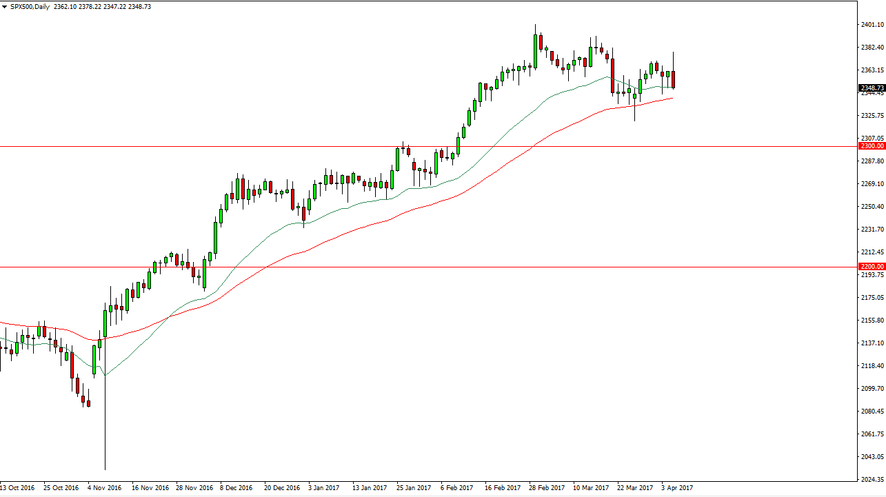 The S&P 500 tried to rally most of the day on Wednesday, and made quite a bit of headway. However, the market turned right back around as the FOMC Meeting Minutes seem to have spooked the market a bit. There is a significant amount of support just below though, so I think once the dust settles this will end up being a buying opportunity. I don’t know that I would buy it today, but I would be looking for a supportive daily candle to take a short-term buying opportunity. I believe that the absolute floor is somewhere near the 2300 level, and as long as we can stay above there I’m going to sit on the sidelines and wait for opportunities to go long.