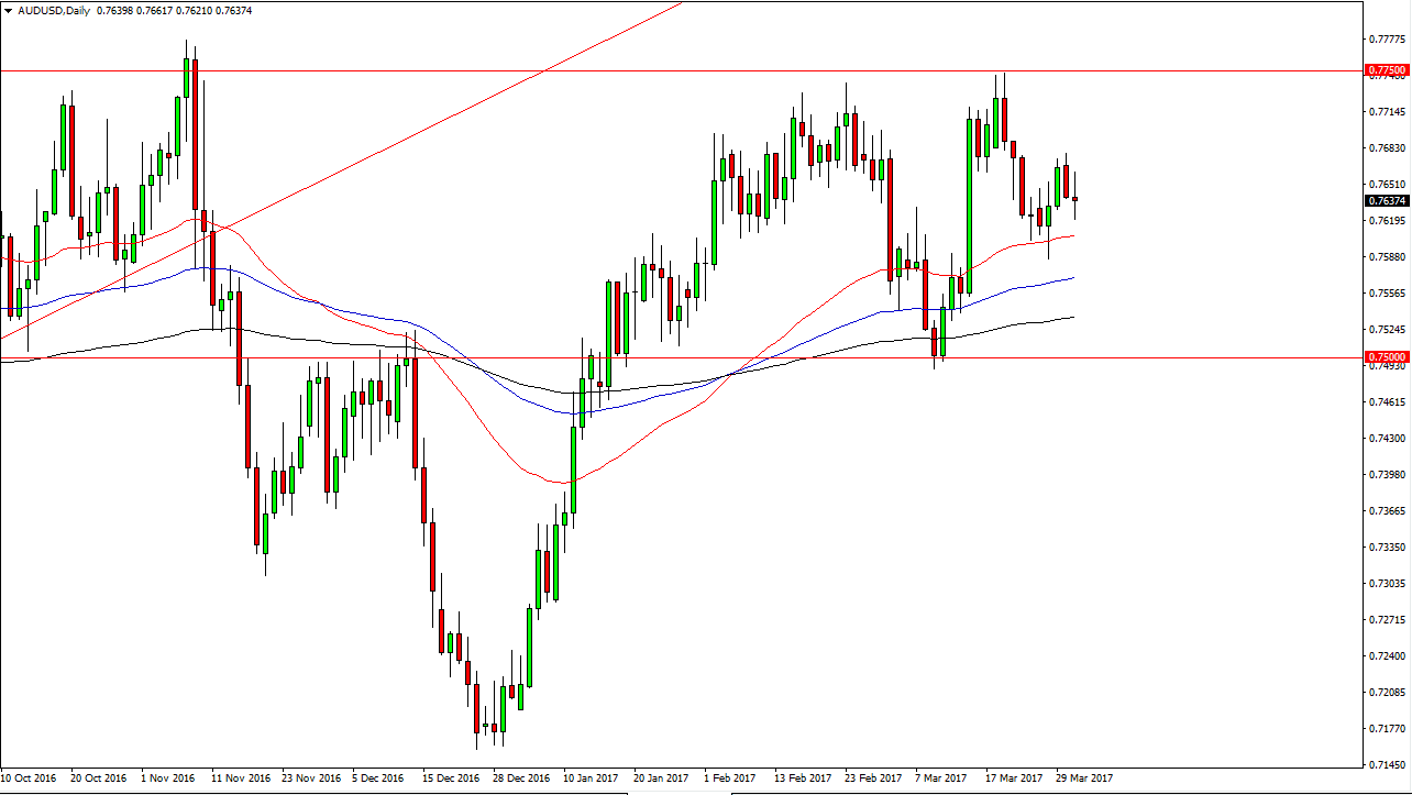 The Australian dollar was rather choppy during the day on Friday, forming a rather neutral candle. It still looks as if the 50-day exponential moving average underneath should continue to offer support, pictured in red. I believe that the gold markets will continue to have an influence on the Australian dollar as per usual, and currently they are looking to break out to the upside and above the $1260 level. We have not done that yet, but given enough time I think we will.