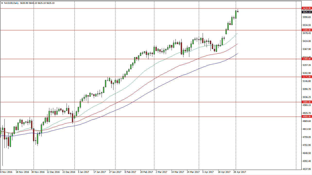 The NASDAQ 100 reached towards the 5650 level but turned around during the day to form a bit of a shooting star. Having said that, with probably more important is the fact that Apple released its earnings after the bell rang, and they were a slight disappointment. That tends to weigh heavily upon the NASDAQ itself, so I think that we could get a little bit of a pullback. Nonetheless, that pullback is a positive thing as we have been a bit overextended. I would expect to see a lot of support at the 5500 level, and therefore have no interest in selling. Instead, I would rather wait for some type of significant pullback that I can take advantage of and use as value. This is a market place the quite frankly has lead the way for other indices and therefore I don’t want to bet against it. Alternately, we could break above the 5650 handle and that would of course be a buying opportunity as well. Nonetheless, I do prefer the pullback as it offers a better entry.