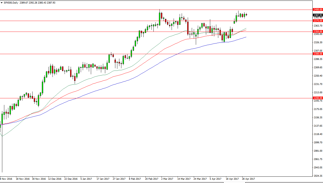 The S&P 500 had a relatively flat day with a slightly negative close during Tuesday’s trading hours. It looks currently that were stuck between 2375 on the bottom, and 2400 on the top. As soon as we can break above the 2400 level, I think that the market is ready to go much higher. This recent action has seen a gap, followed by consolidation. It typically means that we will eventually see some type of continuation of the move, and that’s essentially what I’m relying on. Pullbacks on short-term charts should continue to be buying opportunities and of course the breakout certainly will be as well. I still have a target of 2500 and am still very encouraged by what we have seen as of late.