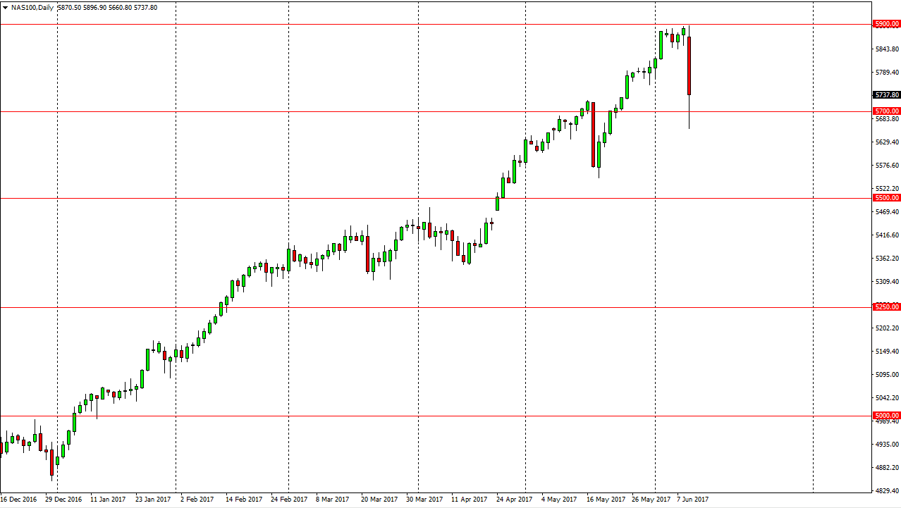 The NASDAQ 100 broke down precipitously during the day on Friday, and even broke down below the 5700 level one point. Having said that, we did find support just below there, and the NASDAQ 100 is showing signs of life. I’m not ready to buy this market yet, I would rather see a full day of stability, but quite frankly the selloff was probably overdue and it was due to just a few stocks such as Alphabet, (Google) and Apple. This being the case, I do think that eventually traders will come back into this market and quite frankly I think that the farther we drop, the more interesting it becomes. I believe the market will still continue to go towards the 6000 handle above there. Wait for the market to calm down a bit, then look to pick up value as the NASDAQ 100 look so healthy.