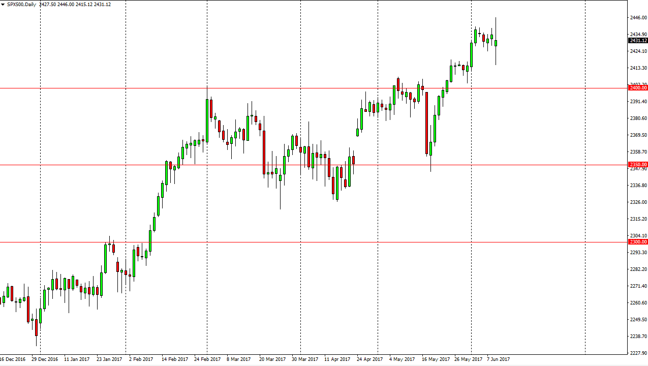The S&P 500 had a very volatile session on Friday, initially going higher and reaching towards the 2450 handle, but then turning around and breaking down rather significantly. A lot of this would’ve had to do with sector rotation in the stock market, as the technology sector had gotten far too ahead of itself. This was seen in the NASDAQ 100, and of course fell in the S&P 500. It looks as if the 2400 level below continues to offer significant support, so I think the dips will continue to offer buying opportunities in what is a very strong uptrend. Remember, stocks tend to “climb a wall of worry”, and that means that sudden selling can compound itself as we saw during the Friday session. I still believe in the uptrend, I think it’s only a matter of time before we go even higher. I believe that the market is still going to target the 2500 level above.