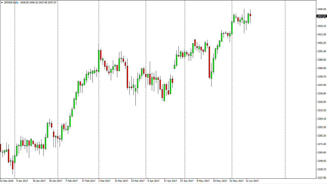 The S&P 500 went back and forth during the day on Wednesday, as the markets try to position themselves due to the Federal Reserve announcement. The market continues to look bullish overall though, because quite frankly when it up forming a bit of a hammer. The hammer sits on top of a previous hammer, and I think that the longer-term uptrend is still very much intact. I have a longer-term target of 2500, which of course is a large, round, psychologically significant number. I believe that it will take some work to break above their, but eventually we could. It may take several attempts to do so, but I do think that we break above that level. Pullbacks should find support quickly, and I believe that the 2400 level is essentially the “floor” in the market.