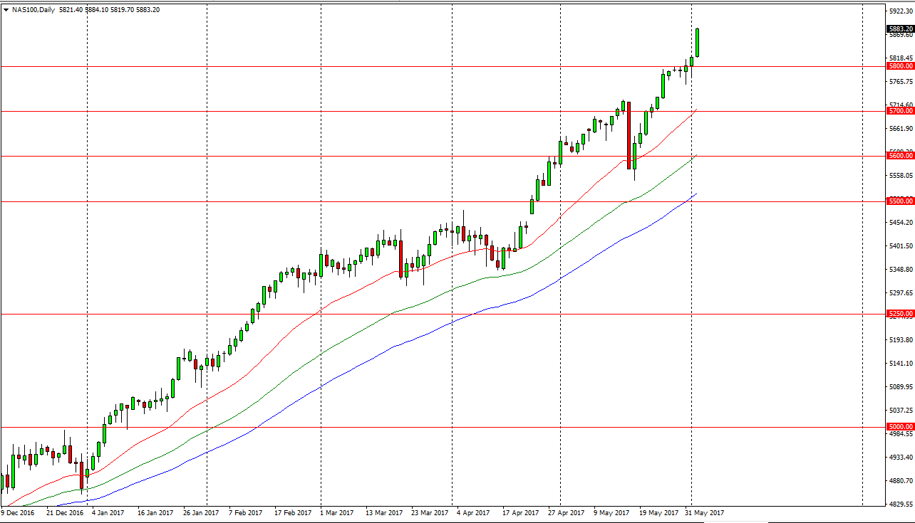 The NASDAQ 100 also exploded to the upside, breaking the top of the hammer from the Thursday and the hammer from the Wednesday sessions. The 5800 level looks to be very supportive, and we close to the very top of the range. Because of this, I’m very confident in the bullish uptrend, and believe that we are going to go looking for the 5900 level, followed by the 6000 level longer term. The 6000 level will course be very psychologically important, so I would expect to see a bit of selling in that area. Nonetheless, I am very bullish of the longer term as well, and believe the dips offer value in this market just as they do in the S&P 500. If we can break above the 6000 level, that would be extraordinarily strong, but I highly doubt is going to happen at the first attempt.