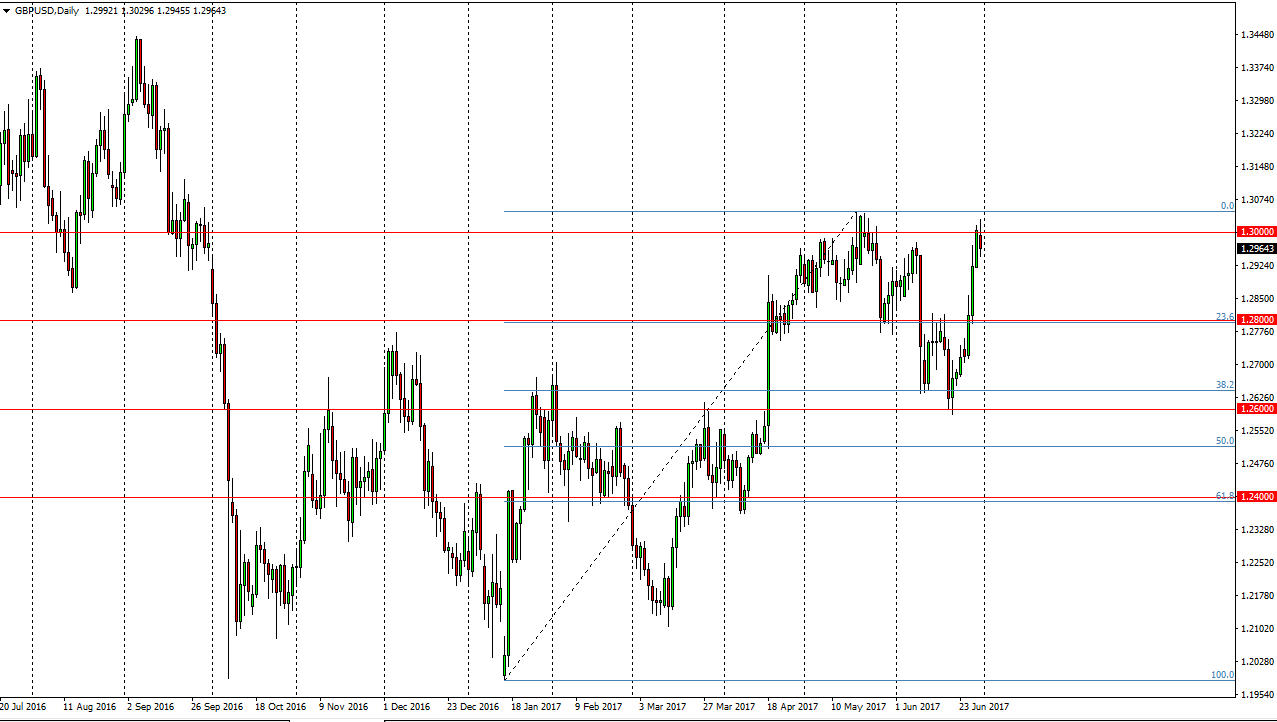 The GBP/USD pair tried to rally during the day on Friday, breaking above the 1.30 level. There is a significant amount of resistance above there to keep this market somewhat lower. The 1.3050 level above being broken to the upside should send this market looking to the 1.3450 level. However, we are a bit overextended, so short-term pullback would make quite a bit of sense. The 1.28 level underneath should be massively supportive, and that could be a nice buying opportunity as this market continues to look bullish, but is a little bit overdone currently. Ultimately, I have no interest in shorting this market, because quite frankly shorting this market is going against what has been a very impulsive move recently. With Mark Carney suggesting that the Bank of England may have to raise interest rates quicker than people thought, this of course is a very bullish sign.