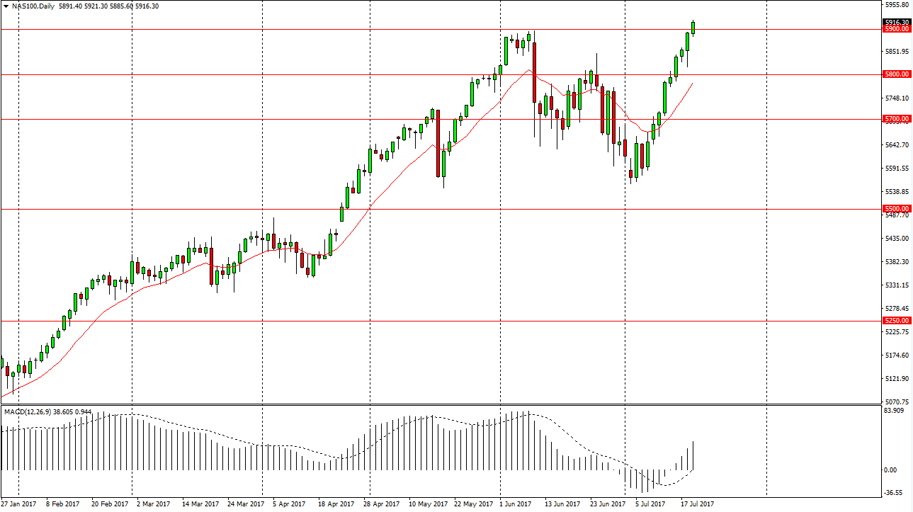 The NASDAQ 100 broke to the upside during the day, slicing through the 5900 level. That’s an area being broken above that signals we are probably going higher, and my target has been 6000 for some time. Now that we’ve done this, I believe that short-term pullbacks continue to be buying opportunities, especially if we can stay above the 5900 level. Ultimately, I believe that the market is a bit overbought, but I also believe that we should continue to see value hunters coming back into the marketplace and taking advantage of cheaper prices. I believe that the market will go looking for 6000, but at that point I would expect a very significant amount of resistance due to the large, round, psychologically significant nature of the number, and of course the fact that we will have been very overdone to the upside. Given enough time, I expect that we may even break above there though.