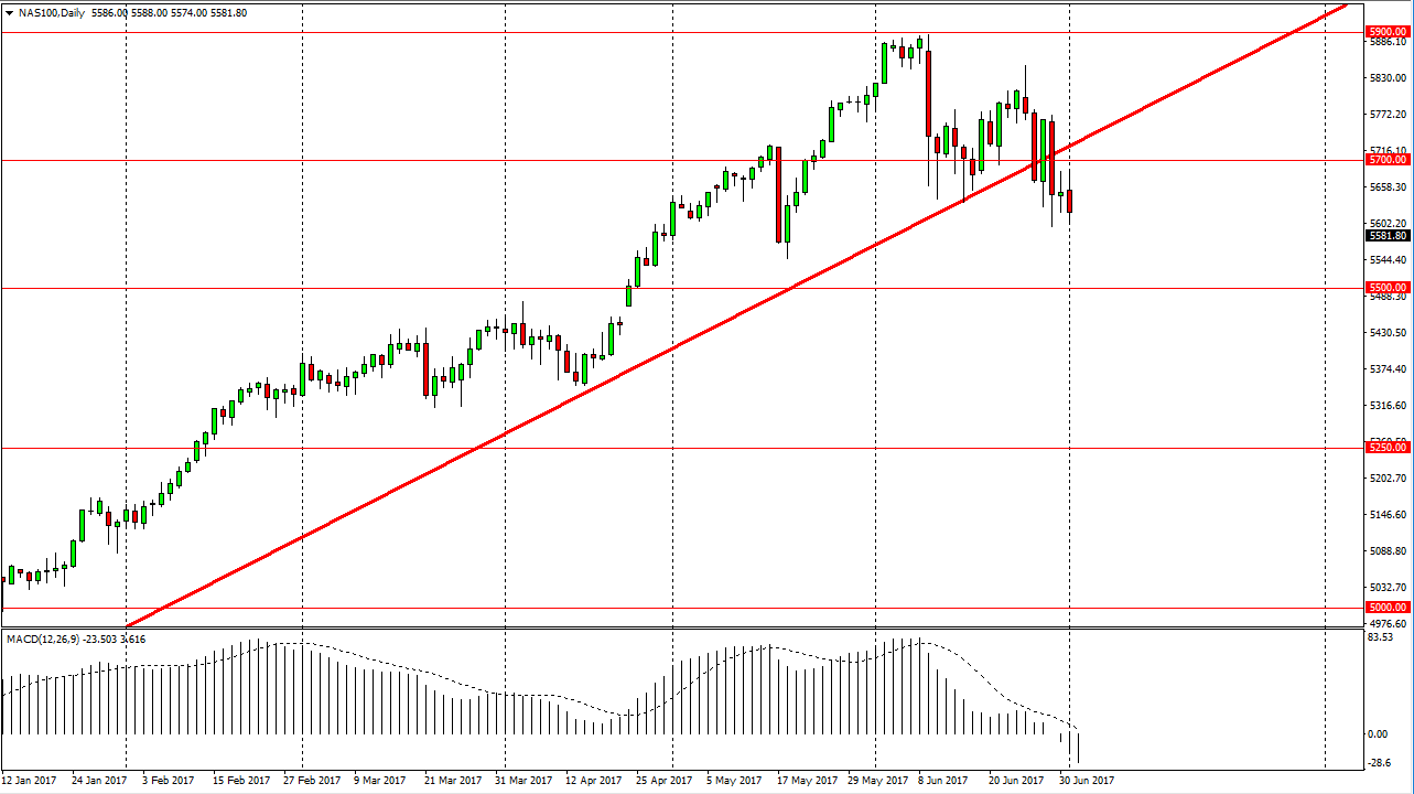 The NASDAQ 100 tried to rally initially during the day but turned around to form a negative candle. It looks as if we’re going to try to break down, if we do the market could go looking for the 5500 level. A breakdown below there would be even more bearish, but I think that there should be a certain amount of psychological support in that general vicinity. Alternately, if we go higher I think that there is significant resistance at the 5700 level, so break above there would be a bullish sign. The MACD continues to roll over to the downside, so I think it’s only a matter of time for breakdown, and I should admit that the technicals are looking very bad for this market. However, if we were to break above the 5700 level, I think we would then see enough momentum shift to the upside that the buyers may take control again. Remember, although the CFD markets are active today, the underlying index is not.