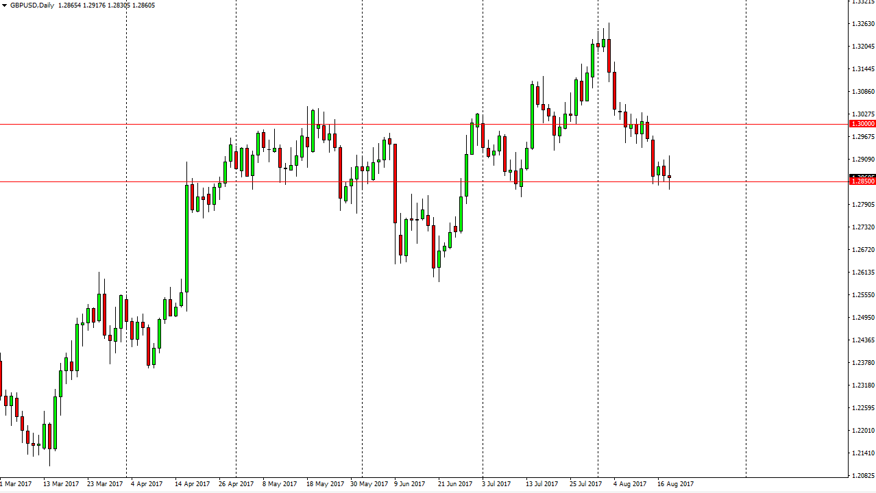 The British pound went back and forth during the day on Friday, hovering above the 1.2850 level. The market looks as if it is trying to decide where to go next, and quite frankly I think that a break below the bottom of the candle would be very bearish, perhaps sending this market down to the 1.26 level. Alternately, if we can break above the top of the candle, that should send this market looking towards the 1.30 level longer term. I think that there is still more bearish pressure than bullish in this market, so having said that it’s likely that we will continue to see sellers jump in and I would find it very surprising if we can break above the 1.3050 level, which would become more of a “buy-and-hold” type of move just waiting to happen. Ultimately, I believe that the British pound has major issues.