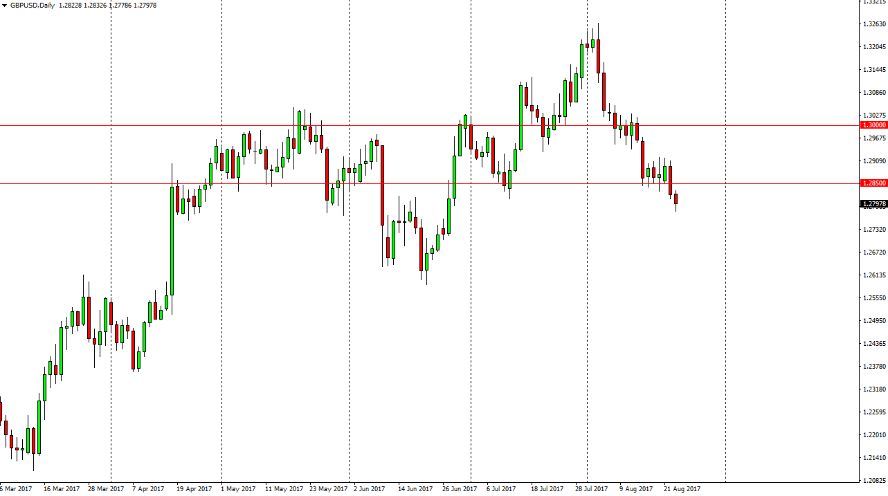 The British pound fell slightly during the day, but found a bit of support towards the end of the session. Because of this, looks as if the market may try to retest the 1.2850 level above, and I think that the market will continue to be attracted to rallies for selling opportunities. If we break down below the bottom of the candle, it’s likely that the market will probably go down to the 1.26 level underneath, as it was support previously. The British pound is getting sold off against most currencies in general, so I think that the market continues to struggle. I look at rallies as an opportunity to pick up “value” in the US dollar, as the British pound has fallen out of favor yet again. GDP numbers come out today from the United Kingdom, so that of course could cause a bit of noise. Unless they are explosive to the upside, I imagine that the British pound is a “cell the rallies” type of market.