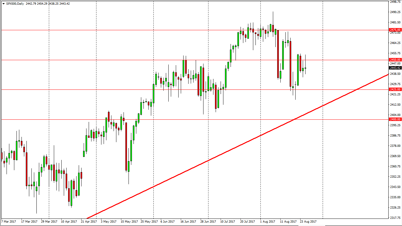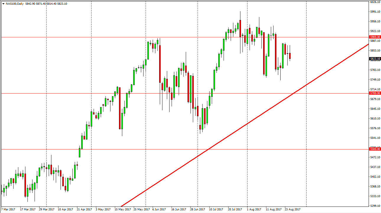 The S&P 500 initially tried to rally but turned around to form a shooting star. The 2450 handle is massively resistive and the shooting star is very likely to signify that we could roll over yet again. I think a breakdown below the bottom of the candle is a move to the 2425 handle just waiting to happen. Ultimately, there is an uptrend still going on, but we may need to continue to pull back and find support going forward. The market is a little over heated currently, so I think that the market could need to look at lower levels for buying pressure. The 2475 level above would be a target, then perhaps the 2500 level. I have no issues in shorting until we get below the 2400 level.