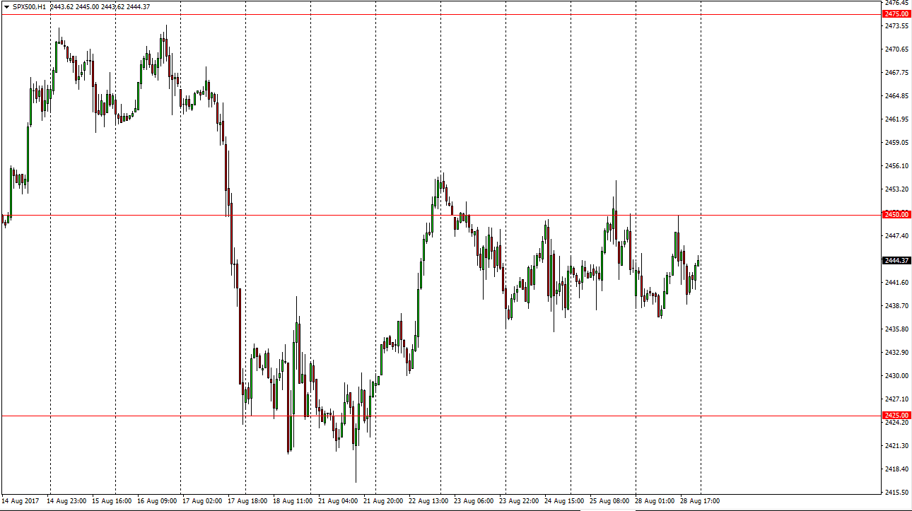 The S&P 500 went back and forth during the session on Monday, as we continue to bounce between the 2435 handle on the bottom, and the 2450 level on the top. I think eventually we will make some type of decision, and if we can break above the 2455 handle, I think the market is free to go much higher. The next obvious target would be the 2475 handle, and then eventually the 2500 level. I think pullbacks offer value that people will be willing to take advantage of, especially near the 2425 handle. Keep in mind that this is one of the least liquid times of year, so big moves are not going to be very likely. This is compounded by the jobs number coming out on Friday, which will more than likely influence where this market goes, or in this case doesn’t go, in the meantime.