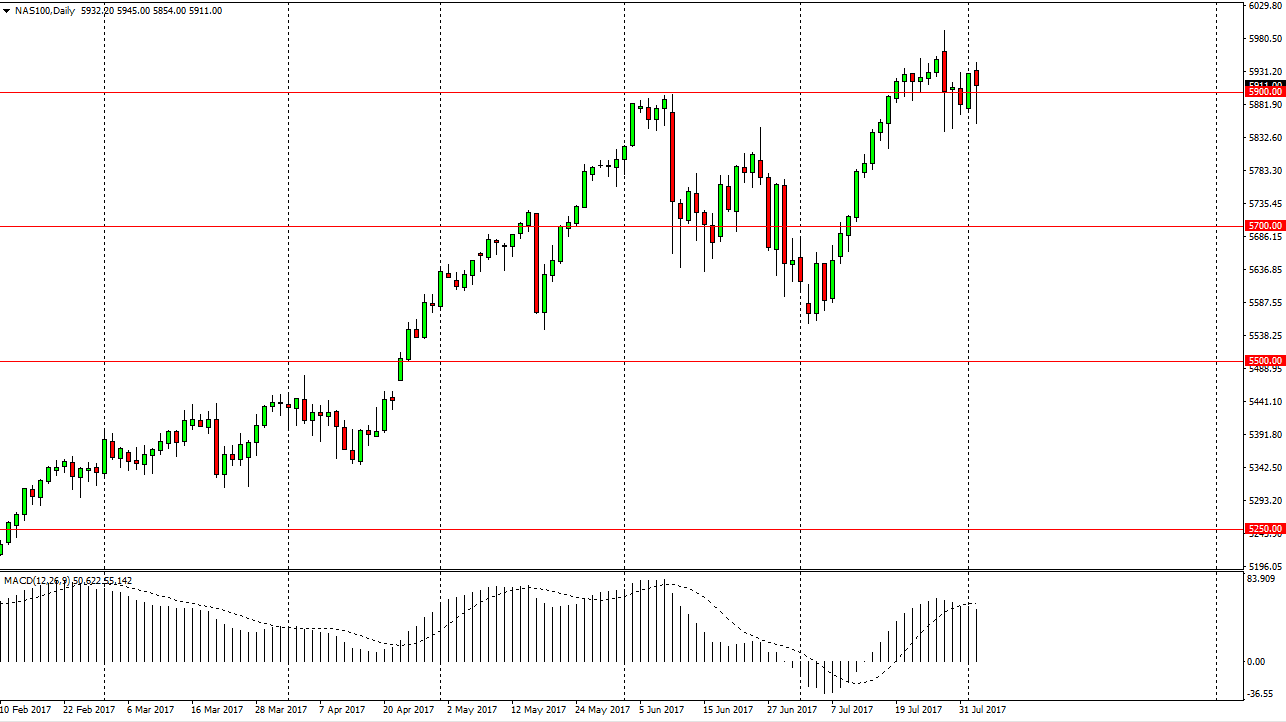 The NASDAQ 100 initially fell during the day as well, but continues to find buyers underneath also. The computerized trading looks at these overall pullbacks as an opportunity to take advantage of value, so as the market has been behaving this way, it’s likely that we should continue to look at pullbacks as buying opportunities. I believe that the 6000 level is the next target, and that the 5900 level is a psychological support level for this market. Again though, the jobs number is tomorrow so is very likely that we could be reasonably quiet during the day. Given enough time, I do think that we breakout above the 6000 handle, but right now I believe that a lot of the volatility is due to the market trying to digest all of the massive gains that we had recently enjoyed. I have no interest in shorting, least not until we break down below the 5500 level, which is all but impossible from what I see.