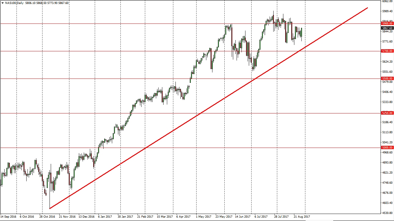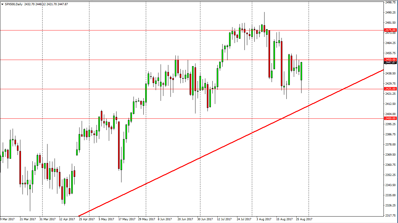 The S&P 500 fell initially at the open on Tuesday, testing the 2420 handle. This was due to the chaos caused by the North Koreans firing a missile over Japan. However, later in the day we started to see US equity traders come back into the market, and let things out. It seems as if the market is still a “buy on the dips” scenario, and with the uptrend line below, I think it is going to be difficult to sell this market for any length of time. Because of this, I believe that the market will continue to offer short-term buying opportunities every time it pulls back. We are in a relatively quiet time of year typically, and certainly the volume is going to be less than desirable as most Americans are away at holiday currently. Nonetheless, selling is all but impossible until we break that trend line.