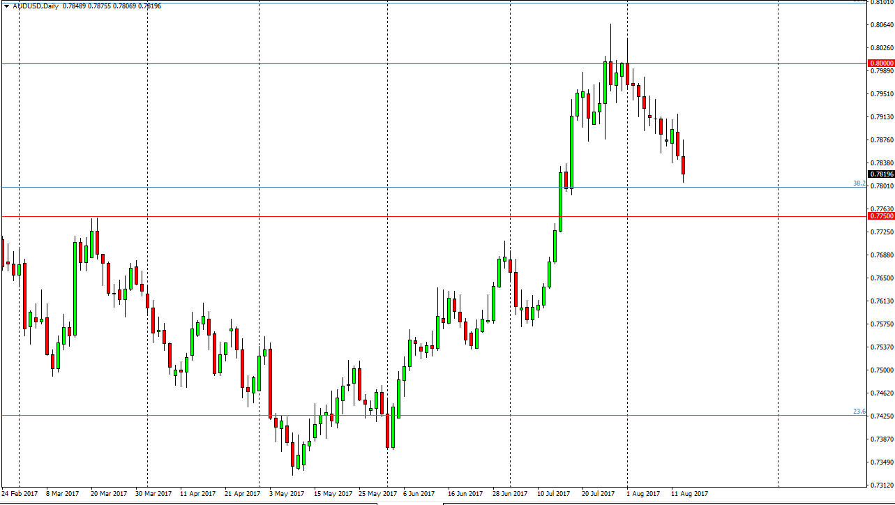The Australian dollar initially tried to rally on Tuesday, but found enough resistance at the 0.7875 level to turn around and drop significantly. The market still has support below that it can probably find though, especially near the 0.7750 level. That was an area that was previously massive resistance, so now that we have broken above there, it makes sense that the market will probably go back to test that level for support. Also, you should pay attention to the gold markets rolling over as the North Korean tension is starting to leave the market. That works against gold, and that by extension works against the value of the Aussie dollar. I don’t necessarily think we are going to go much lower, just that the market is almost certainly going to test the 0.7750 level before making the next move. If we bounce from there, it’s a buying opportunity. However, if we break down below the 0.77 level, the market should continue to go lower.