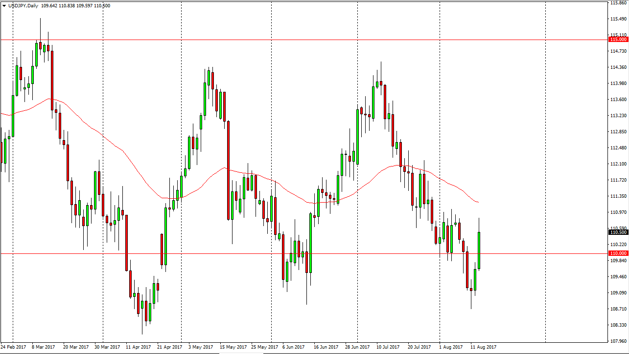 The USD/JPY pair broke higher on Tuesday, slicing through the 110 level. At this point, I believe that if we can break above the top of the range for the day, the market should continue to go much higher. The retail sales figures coming out of the United States were much stronger than anticipated, so this at money flowing into the US dollar. Also, keep in mind that the North Korean situation had been driving yen buying, and therefore the situation abating a bit certainly helps the markets move against the Japanese yen. If we break above the top of the candle for the session on Tuesday, I believe that the market then goes to the 112.50 level. If we managed to break down below the bottom of the Friday candle, I believe at that point the market goes to the 108 handle.