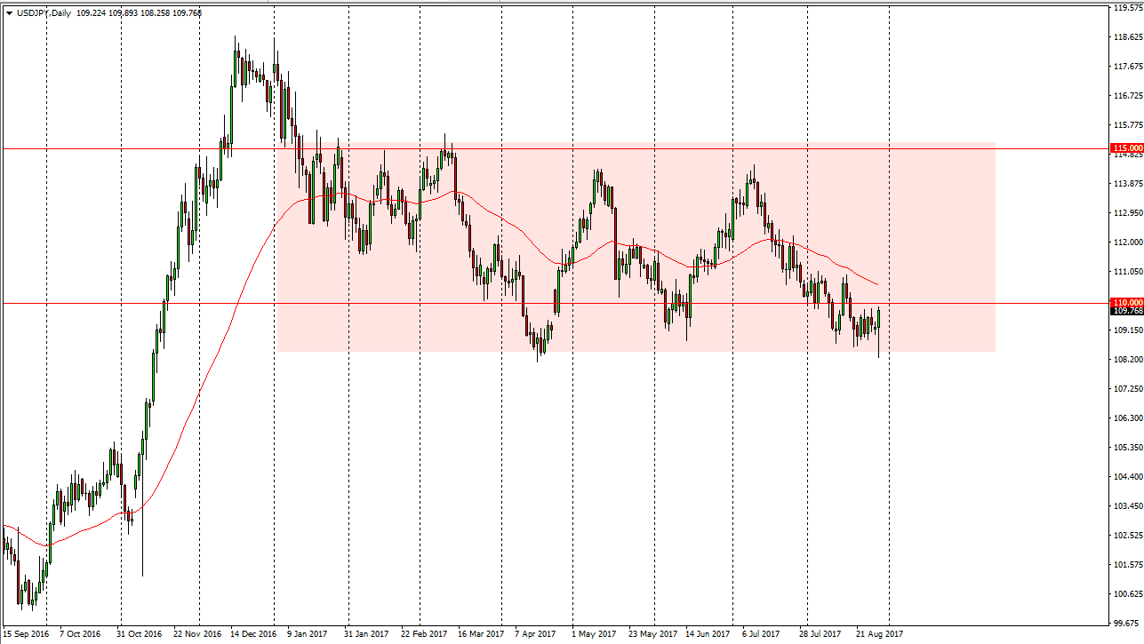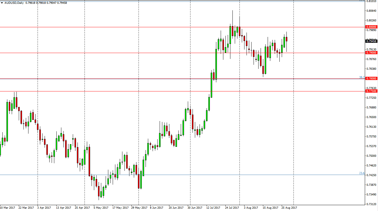 The US dollar initially fell against the Japanese yen as the North Koreans launched a missile across Japan. However, later in the day, specifically during the American session, buyers came back into the market and started picking up risk assets. This lifted the pair, and sent it looking towards the 110 level. This explosive move shows just how well supported the market is, and how the overall consolidation should continue. At this point, buying on pullbacks continues to be the best way to play this market, as the upside of the consolidation area extends all the way to the 114.50 level above. Ultimately, I believe that “buy on the dips” remains the mantra in equities, and therefore will probably be the mantra over here as well as the 2 tend to be highly correlated.