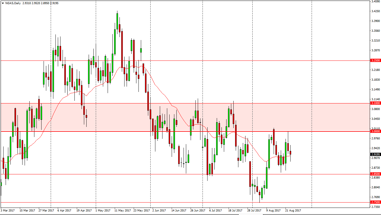 The natural gas markets went back and forth during the day on Wednesday, forming a bit of a neutral candle. The natural gas inventory figures come out today, so that of course could cause quite a bit of volatility. I believe that if we rally from here, the $3 level above should be massively resistive. And exhaustive candle would be a selling opportunity, just as a break below the bottom of the candle from the daily session on Wednesday would be. I think that the $2.85 level underneath should be supportive, but I think that we will eventually break below that level. I recognize that there is a lot of resistance above the $3 level, extending to the $3.10 percent level. I have no interest in buying this market, and I look at any rally as an opportunity to start selling yet again. Today may be volatile, but it could offer a nice opportunity.