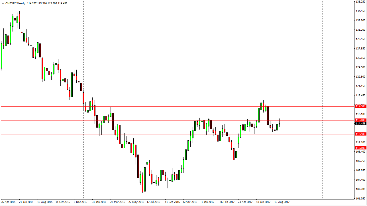 The Swiss franc and the Japanese yen both have been in favor over the last couple of months, so this pair will be vital to pay attention to if you choose to play a risk appetite type of trade. When you look at this chart, you can see that the 112.50 level has offered a significant amount of support. Currently, the 115 level is offering a significant amount of resistance. If we can close above that level on a weekly candle, it’s likely that we will then go to the 117.50 level. That area offered a significant amount of resistance, but a retest of that area would be a very bullish sign for the Swiss franc.