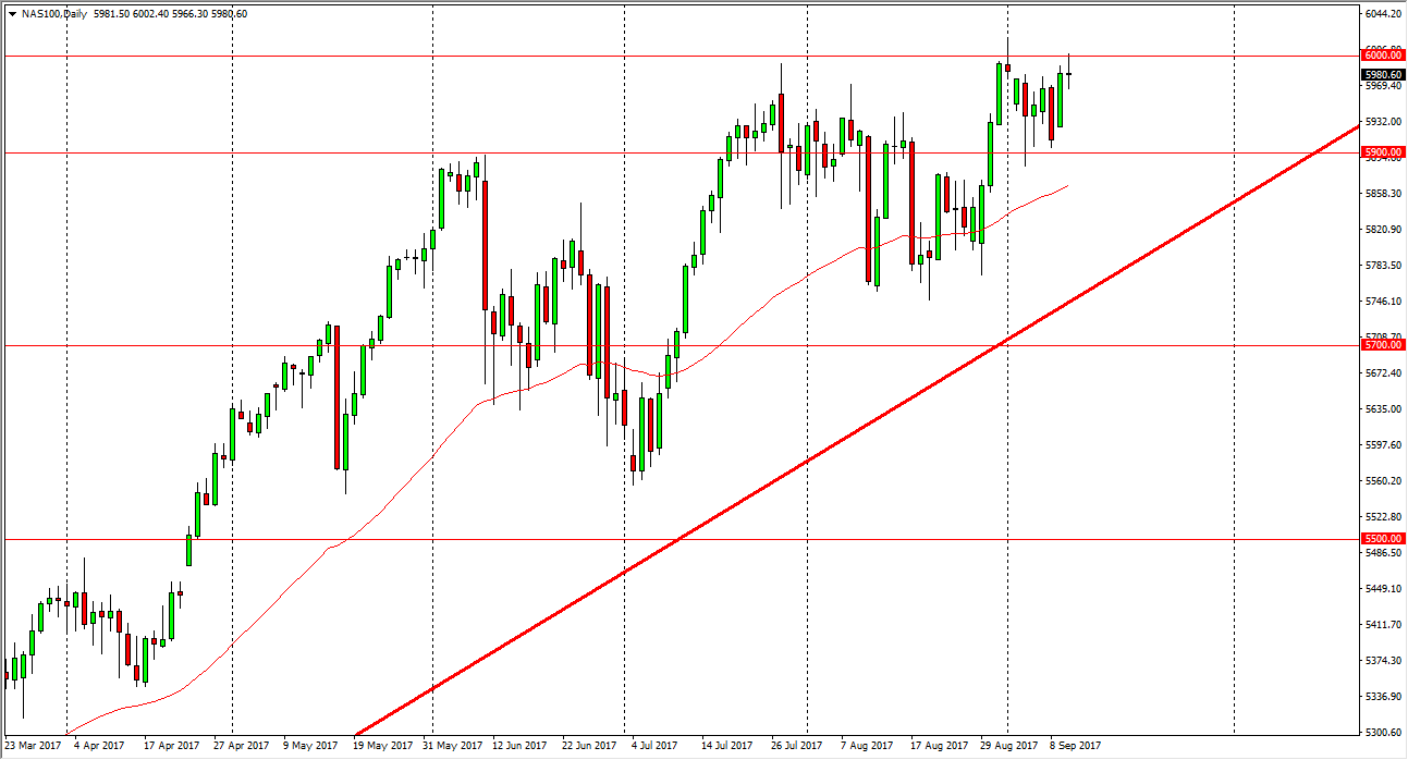 The NASDAQ 100 had a volatile session but the most important thing on this chart is that we continue to find resistance at the 6000 level. While I think a pullback is coming, I believe it short term in nature, and that we will more than likely find buyers below 2 continue the overall consolidation as we try to build up enough momentum to finally clear the 6000 level definitively. Buying dips on short-term charts will probably be the best way to go, just as a daily close above the 6000 handle would be reason enough to start buying. I have no interest in shorting the NASDAQ 100, I believe that the longer-term trend is going to continue to go higher, so therefore patience will be needed but should be rewarded for the buyers of this index. Once we break above the 6000 handle, it becomes more of a “buy-and-hold” scenario.