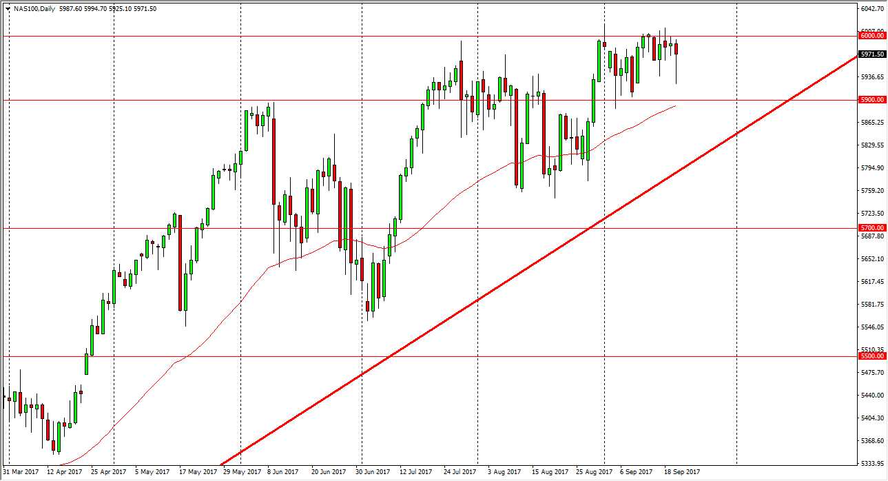 The S&P 500 fell during the session on Thursday, testing the 2500 level. Ultimately, this is a market that seems to find buyers in that area, and even though the Federal Reserve looks likely to clean and balance sheet up, and tighten monetary policy in various ways, the S&P 500 seems impervious to this potential trouble, as the uptrend continues. I believe that buying dips continues to be the way going forward, and eventually I think that the market should then go to the 2525 handle. I believe that there’s no reason to short this market, as there is a strong uptrend that continues to be a major influence in this market place. I believe that eventually we will reach to much higher levels.