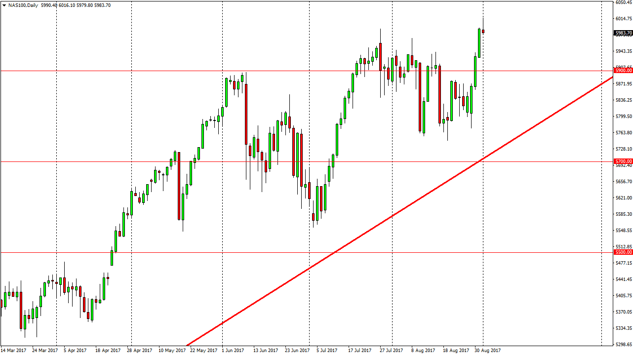 The NASDAQ 100 has broken out to a fresh, new high but the 6000 level has offered enough resistance to turn the market back around. Given enough time, I think that the longer-term uptrend should continue, but the 5900-level underneath will be the floor. We may have to go as low as that level to find buyers, but nonetheless I think that it’s going to be easier to buy markets on dips, as there has been so much in the way of buying pressure previously. The uptrend line has held over the longer term, and until it gets broken to the downside, I think that the market will continue to be attractive. Because of though, don’t put everything into the market in one shot, as the volatility looks to continue and of course the next couple of sessions will be during the quietest week of the year for volume.