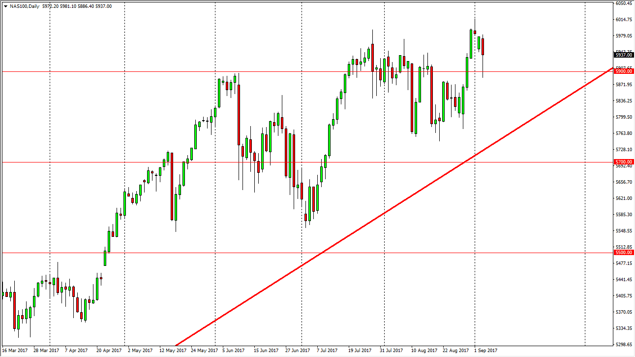 The NASDAQ 100 also fell, but found support near the 5900 level. By bouncing from there and forming a bit of a hammer, that’s a very good sign, and it suggests that the algorithm-based traders are still buying at the loss of roughly 1%. This seems to be a phenomenon that we have seen all summer, and it now looks as if we will go looking for the 6000 level above. I have a trend line on the charts, and it has not been broken. Because of this, I believe that dips continue to offer buying opportunities in what has been a stubbornly bullish market. A daily close above the 6000 level would be a nice signal to start going long on a longer-term move, but until then I think that short-term buying the dips types of moves will probably what we see on the whole. Ultimately, this market tends to lead the rest the US indices.