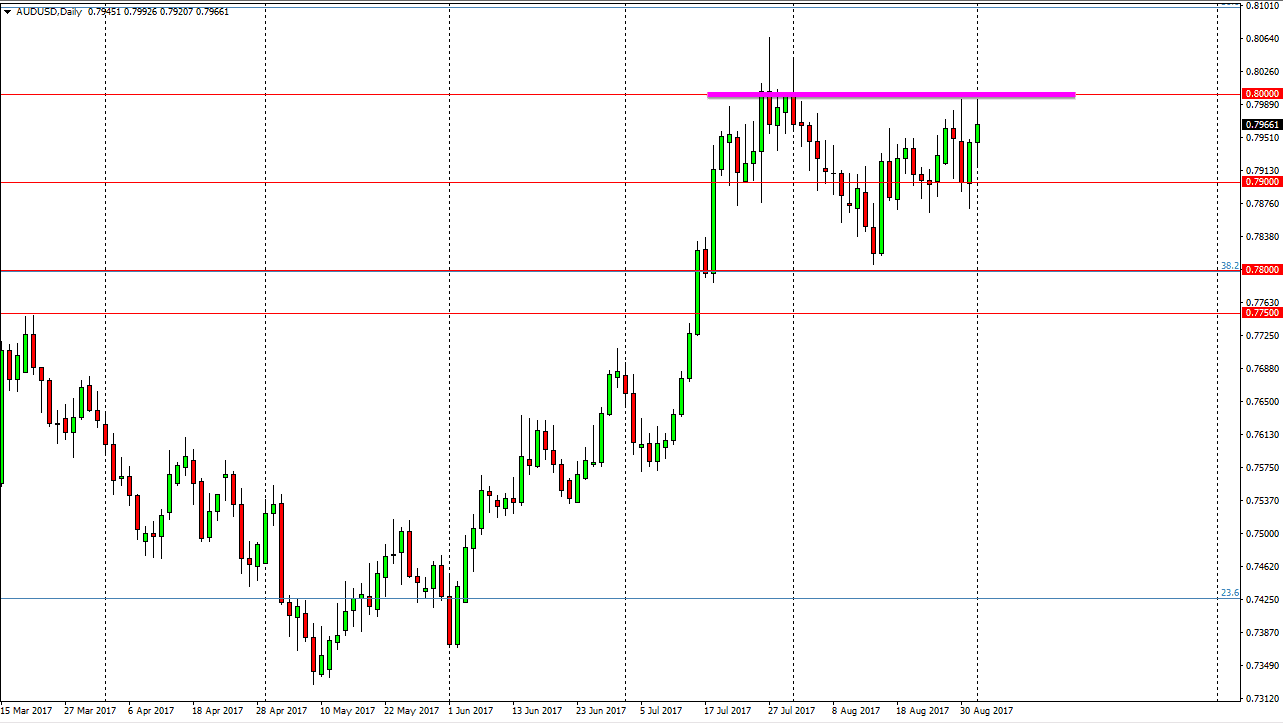 The Australian dollar was very choppy during the session as well, but gold markets continue to look very healthy. Because of this I think that the market will eventually get very bullish of the Australian dollar, and on a daily close above the 0.80 level, I think that it’s time to start buying. Until then, short-term pullbacks could be buying opportunities, but you should be very careful and keep your stop losses tight until we clear that area if you feel the need to go long.