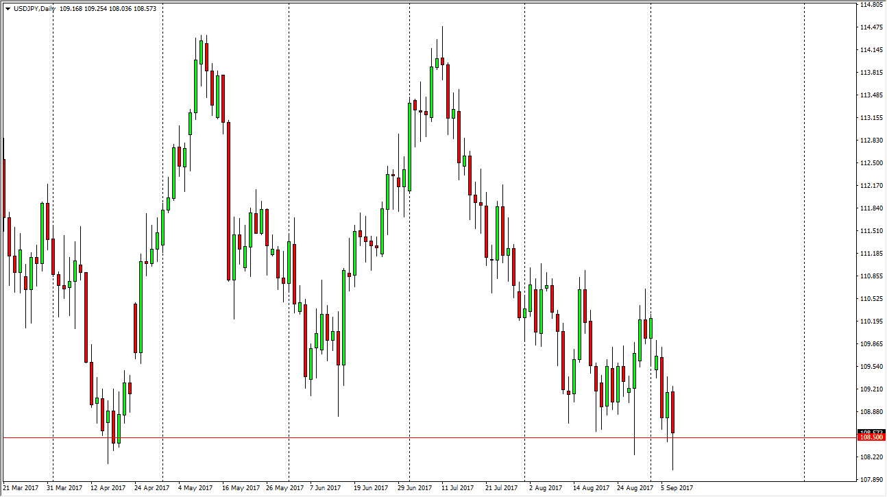 The US dollar fell precipitously against the Japanese yen and of course several other currencies around the world, and as we broke down below the 108.50 level, that was a very bearish sign. At the end of the day, it looks as if the area is trying to hold, but the fact that we broke through it for so long during the session tells me that it is probably only a matter of time before we break down. If we break below the bottom of the range for the session on Thursday, I feel that the market probably goes down to the 105-level next, as it is a large, round, psychologically significant number. Rallies at this point will be selling opportunities or at least ignored until we can break above the 110 handle.