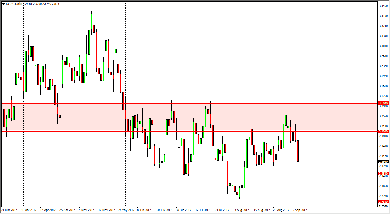 Natural gas markets fell significantly during the day, reaching towards the $2.90 level. There is a significant amount of support underneath, extending down to the $2.85 level. Ultimately, I think that we could get a little bit of a rally from here, bouncing for a short time, but I think given enough time the sellers will most certainly come back. Natural gas markets have been range bound for some time, and the $2.85 level has been very solid, and should continue to be. While I am bearish of this market, I prefer to sell rallies instead of jumping in the market down here. If you’ve been watching, you know that the area between $3 and $3.10 continues to be a massive barrier that the market cannot overcome. With hurricanes missing most of the natural gas infrastructure, and the temperatures cooling off in the United States, demand for natural gas has dropped rather significantly, and should continue to do so.